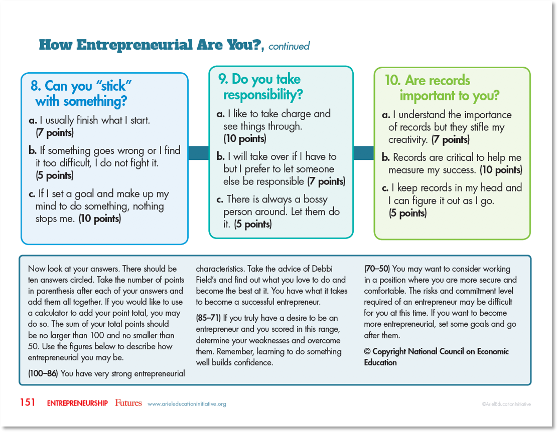 The Entrepreneurship strand helps kids explore how they might want to run their own businesses one day—soon. Many of the kid s you know today could soon be ready to start their very own businesses, becoming the entrepreneurs of tomorrow—with this strong jumpstart from FUTURES—and you! For more information about how to incorporate these worksheets into your lesson plans or family adventures in finance, clik here to download the entire FUTURES: Financially Literate Kids for a Financially Literate Society™ today—with Ariel Education Initiative’s compliments!
